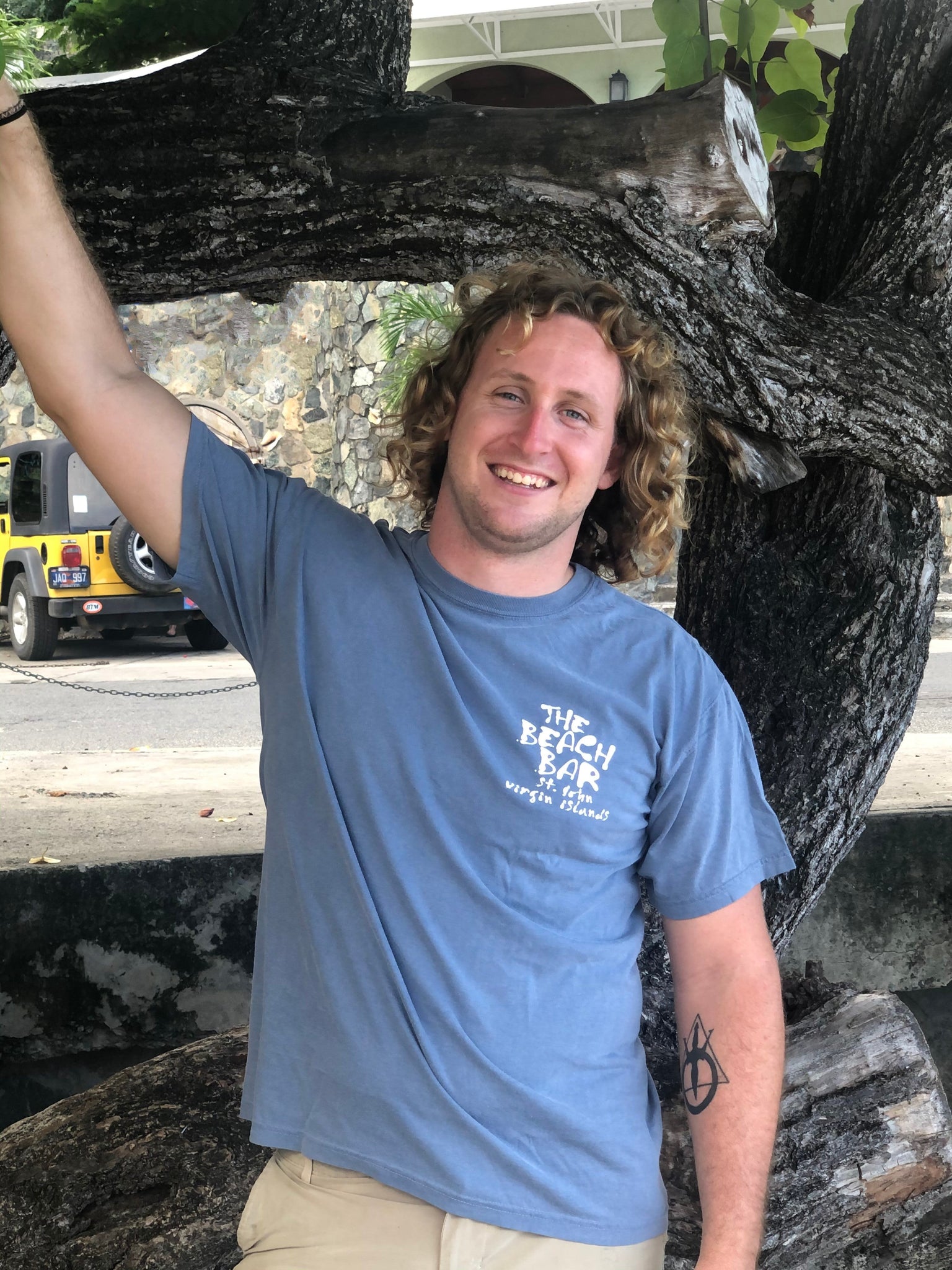 Beach Bar T-Shirt with full color sun on back. Short Sleeve. Available in denim blue.