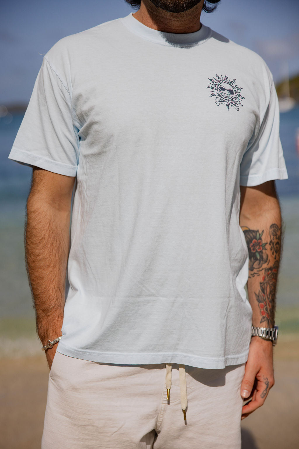 Comfort Colors 1717 Light Blue; 6.1 oz Heavyweight; 100% soft ring spun U.S. cotton fabric; relaxed fit; low shrinkage