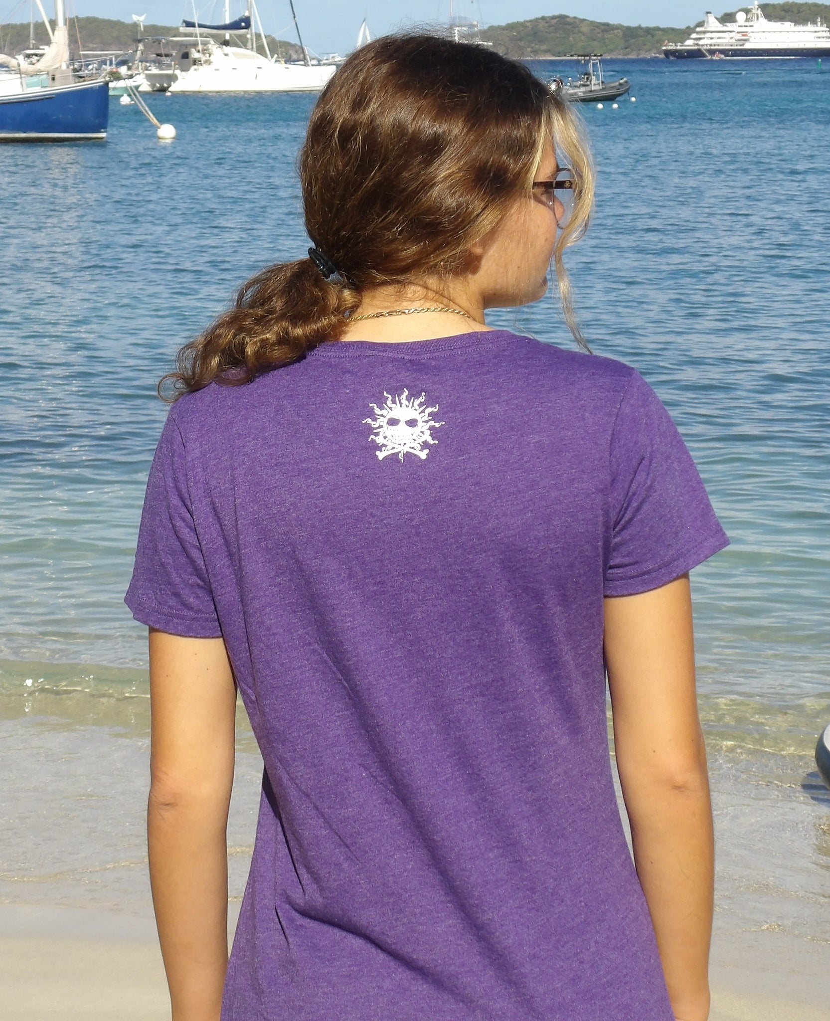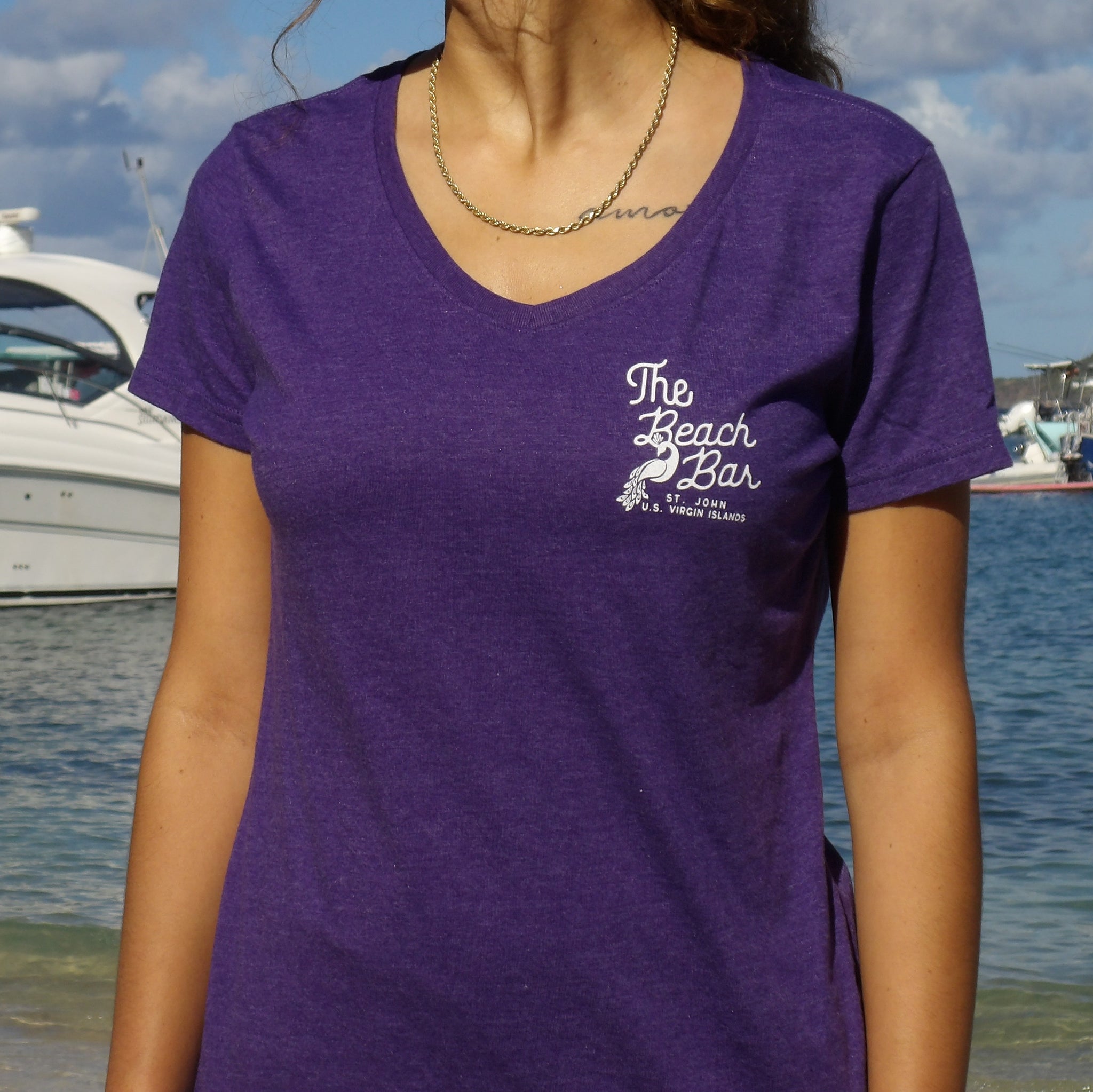 Purple looks great on everyone.... this fun ladies v-neck with a St. John peacock is another fun shirt for your closet.